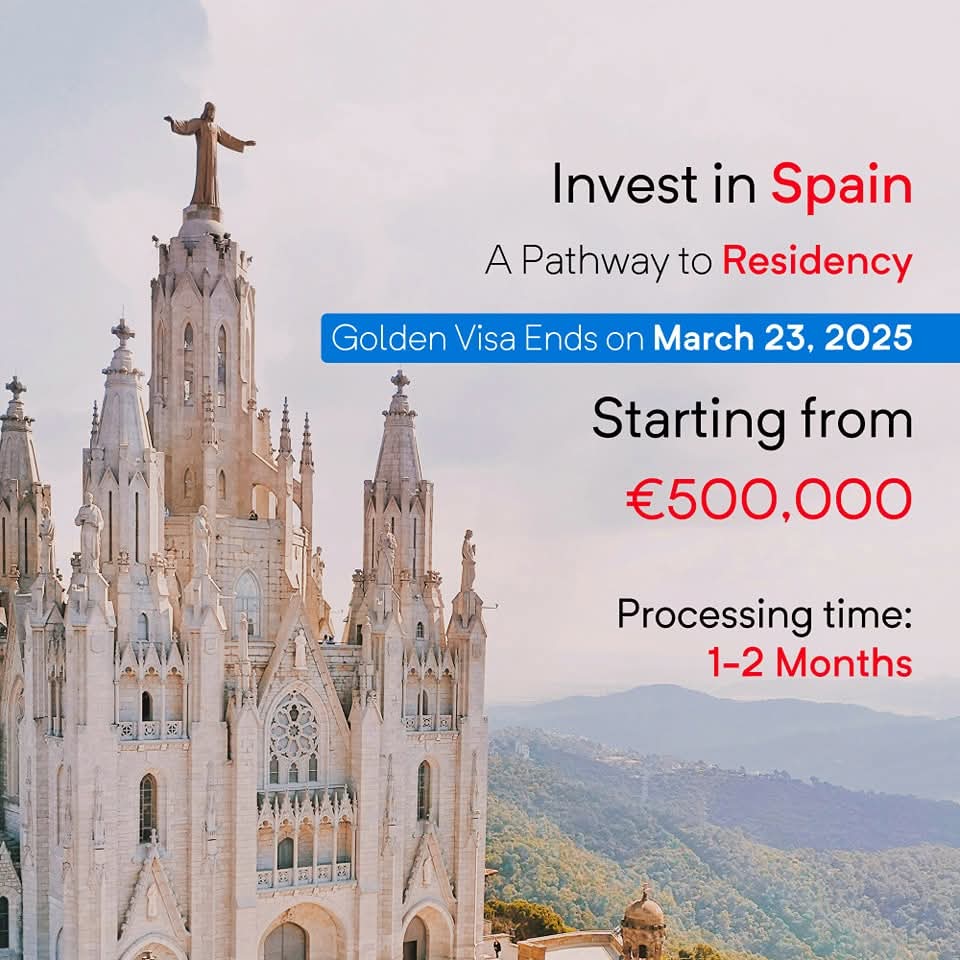 Invest in Spain and unlock a pathway to residency with the Golden Visa program! Starting at £500,000, secure your place in one of Europe’s most vibrant countries. Act now, this opportunity ends on March 23, 2025! With a swift processing time of just 1-2 months, your Spanish residency is closer than ever.