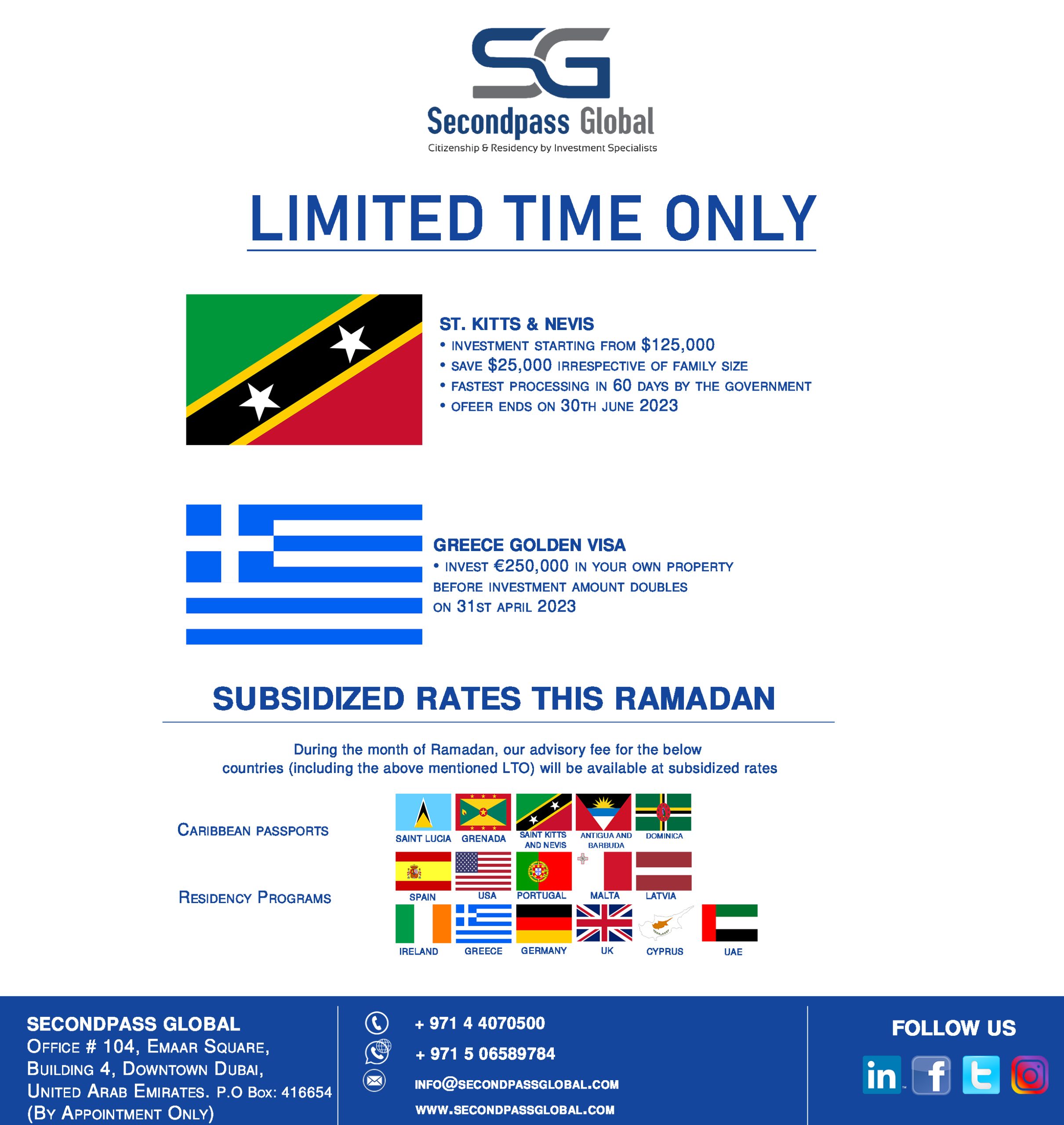On March 22, 2023, Secondpass Global featured in Gulf News as a leading company in the Residency and Citizenship by Investment industry. The company made an exclusive announcement of their RAMADAN OFFER, which provides a subsidized rate on their advisory fee.